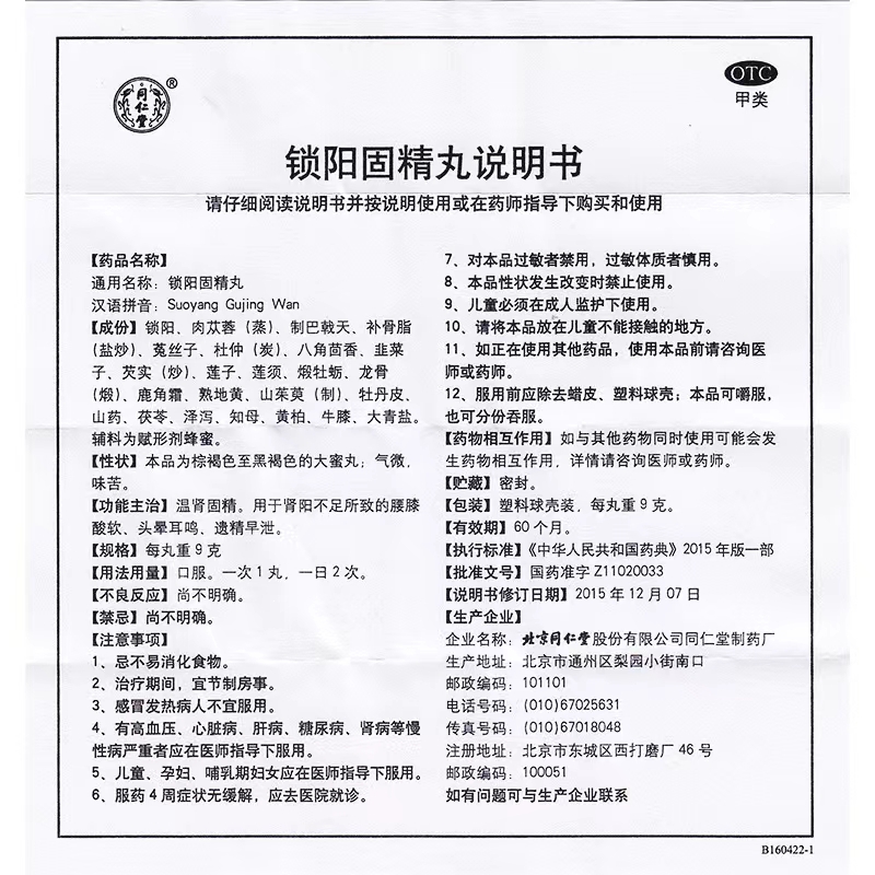 品  名: 锁阳固精丸(蜜丸)