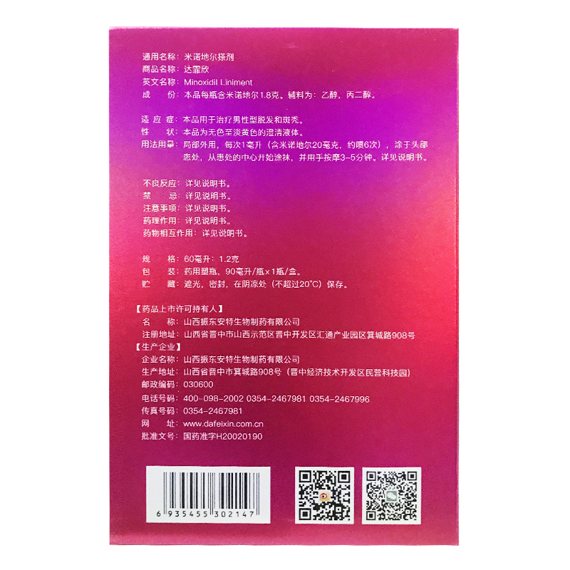米诺地尔搽剂(达霏欣)女 90ml(60ml:1.2g) 山西振东安欣生物制药有限公司(原山西振东