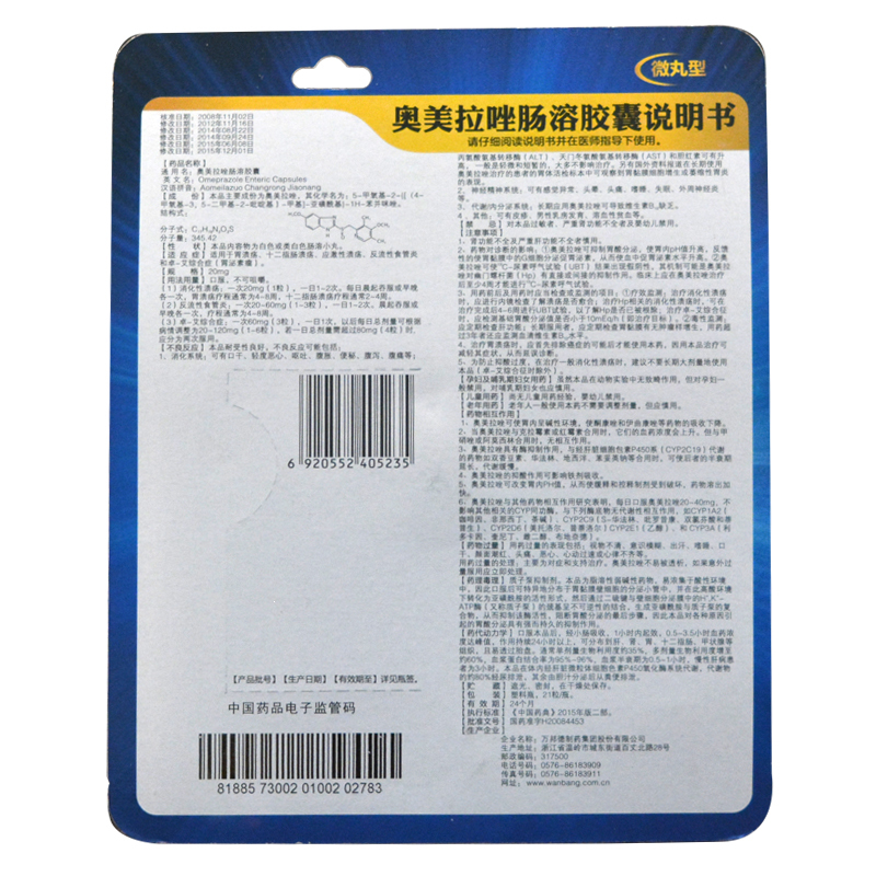 奥美拉唑肠溶胶囊 20mg*21s 万邦德制药集团股份有限公司