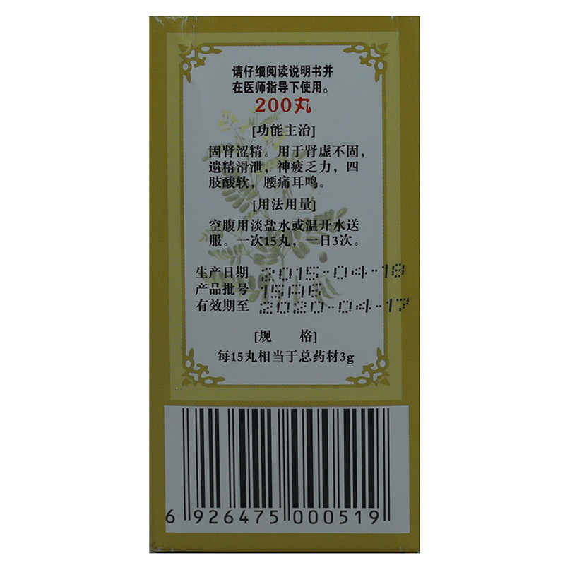 主治精滑不禁、真元亏损、梦遗滑精、盗汗虚烦、腰痛耳鸣、四肢无力。
