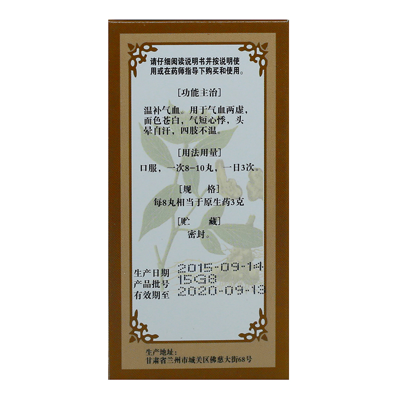 用于气血两虚,面色苍白,气短心悸,头晕自汗,体倦乏力,四肢不温,月经量多。