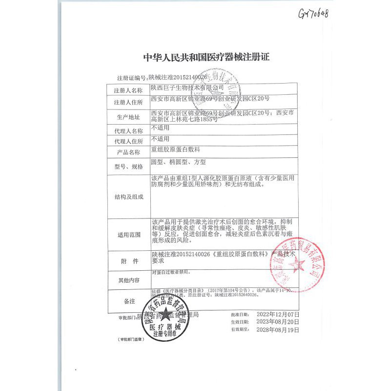 重组胶原蛋白敷料(可复美面膜) HCDO2422*5片 陕西巨子生物技术有限公司