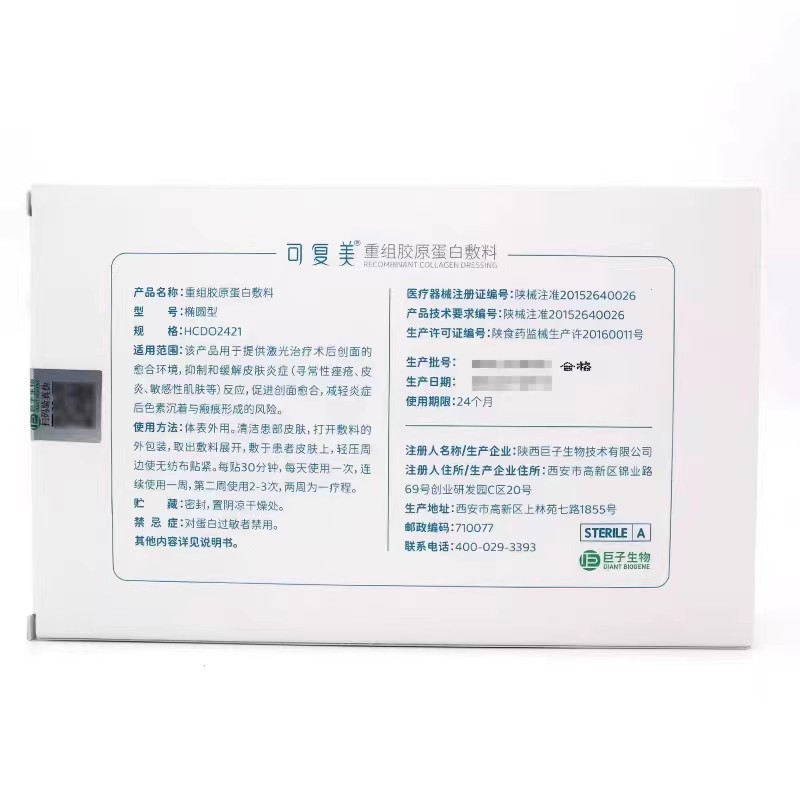 品  名: 重组胶原蛋白敷料(可复美面膜)