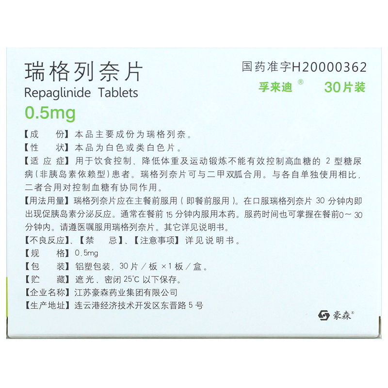 瑞格列奈片 0.5mg*30s(10) 江苏豪森药业集团有限公司(原江苏豪森药业股份有限公司)