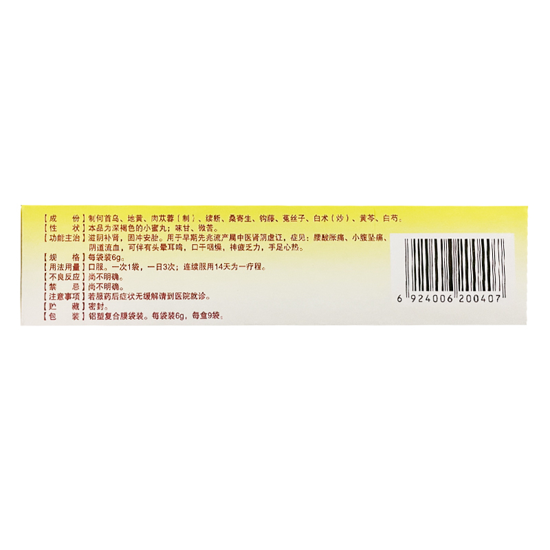 滋阴补肾;固冲安胎。用于早期先兆流产属中医肾阴虚证;症见:腰酸胀痛、小腹坠痛、阴道流血;可伴有头晕耳鸣;口干咽燥;神疲乏力;手足心热。