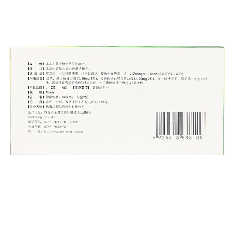 雷贝拉唑钠肠溶胶囊 10mg*14s 珠海润都制药股份有限公司