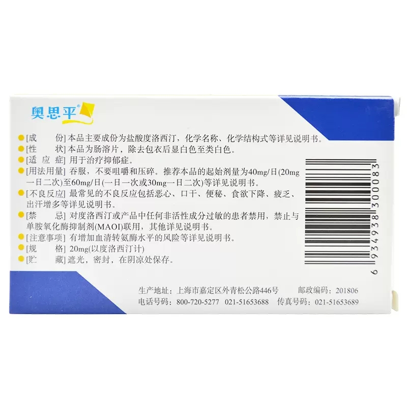 盐酸度洛西汀肠溶片 20mg*20s 上海上药中西制药有限公司(原上海中西制药