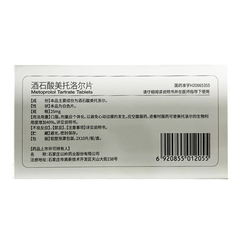 酒石酸美托洛尔片 25mg*10s*2板 以岭万州国际制药有限公司