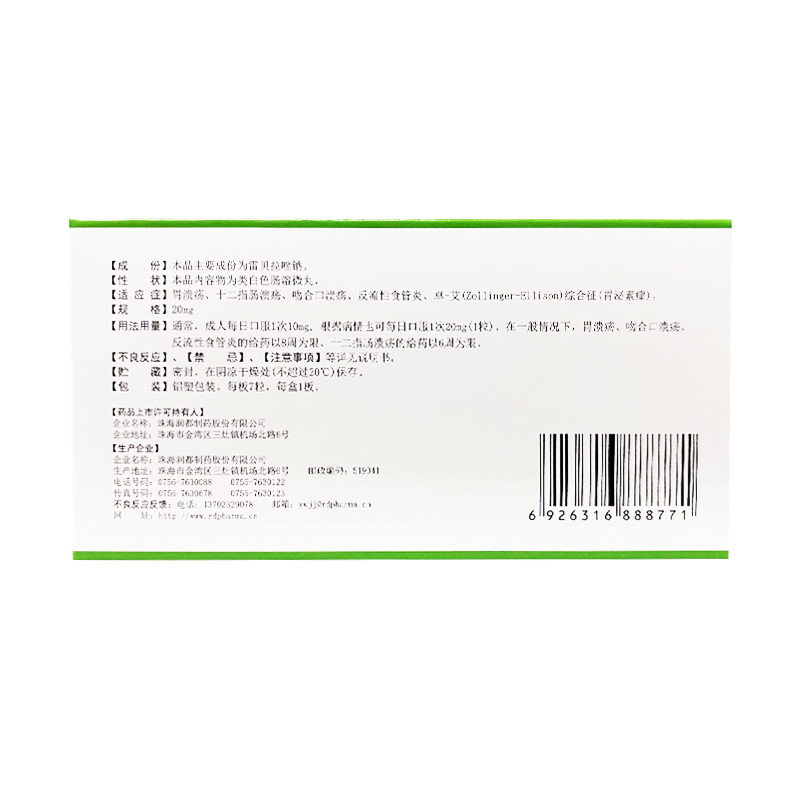 雷贝拉唑钠肠溶胶囊 20mg*7s 珠海润都制药股份有限公司