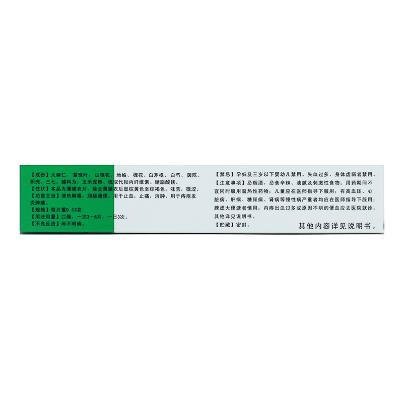 清热解毒,润肠通便。用于止血,止痛,消肿。用于痔疮发炎肿痛。