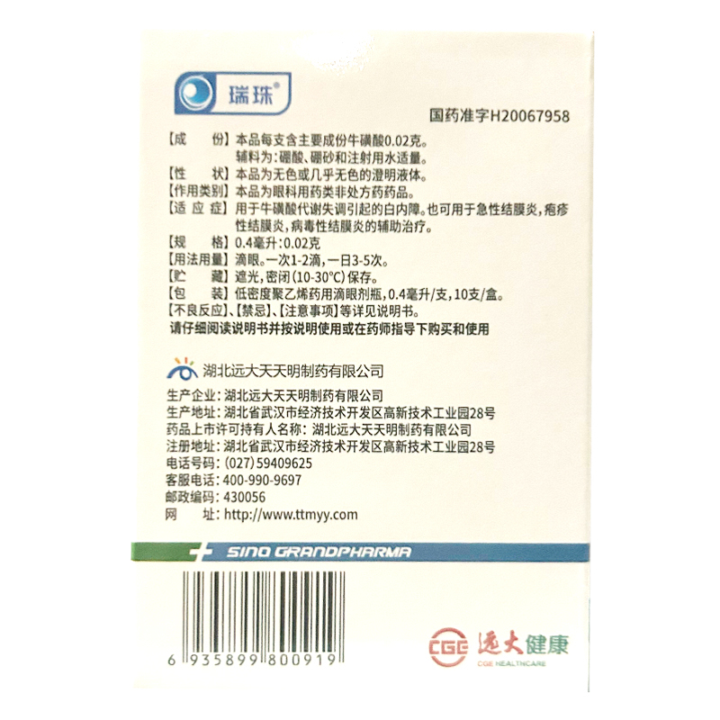 牛磺酸滴眼液 0.4ml:0.02g*10支 湖北远大天天明制药有限公司