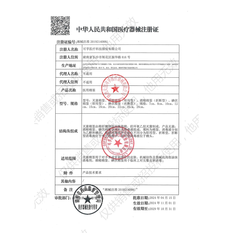 医用棉签(灭菌级) 10cm*50支 湖南可孚医疗设备有限公司