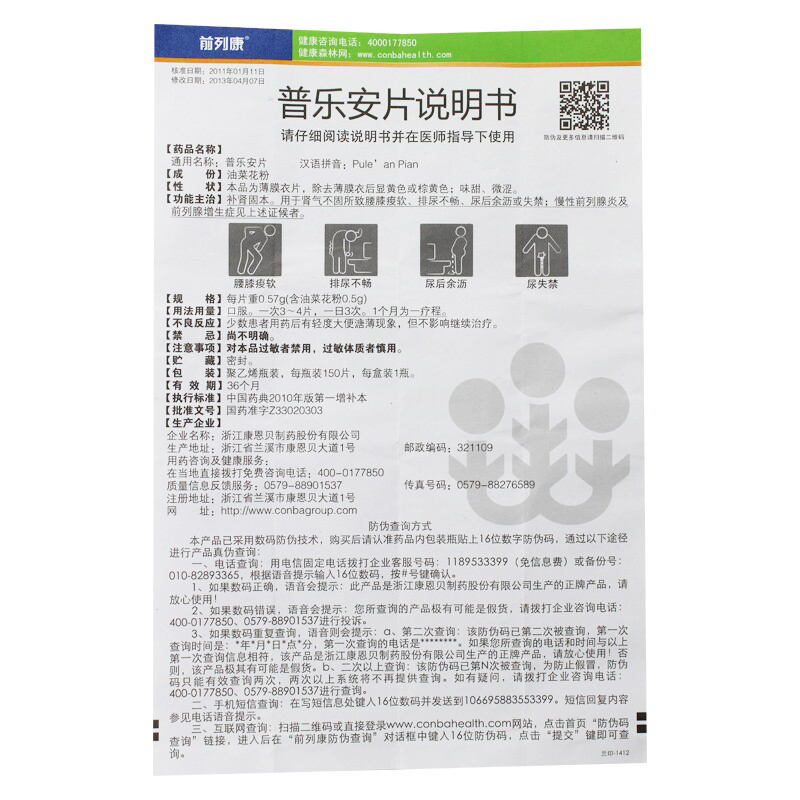普乐安片 0.57g*150s 浙江康恩贝制药股份有限公司