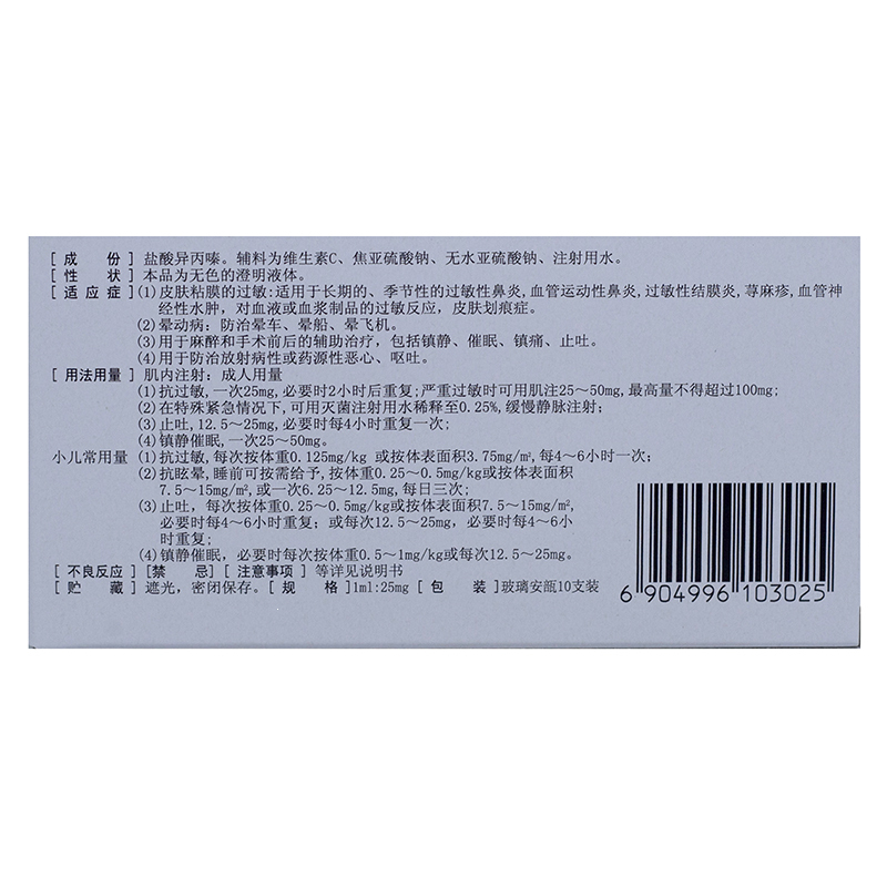 盐酸异丙嗪注射液 1ml:25mg*10支 上海禾丰制药有限公司