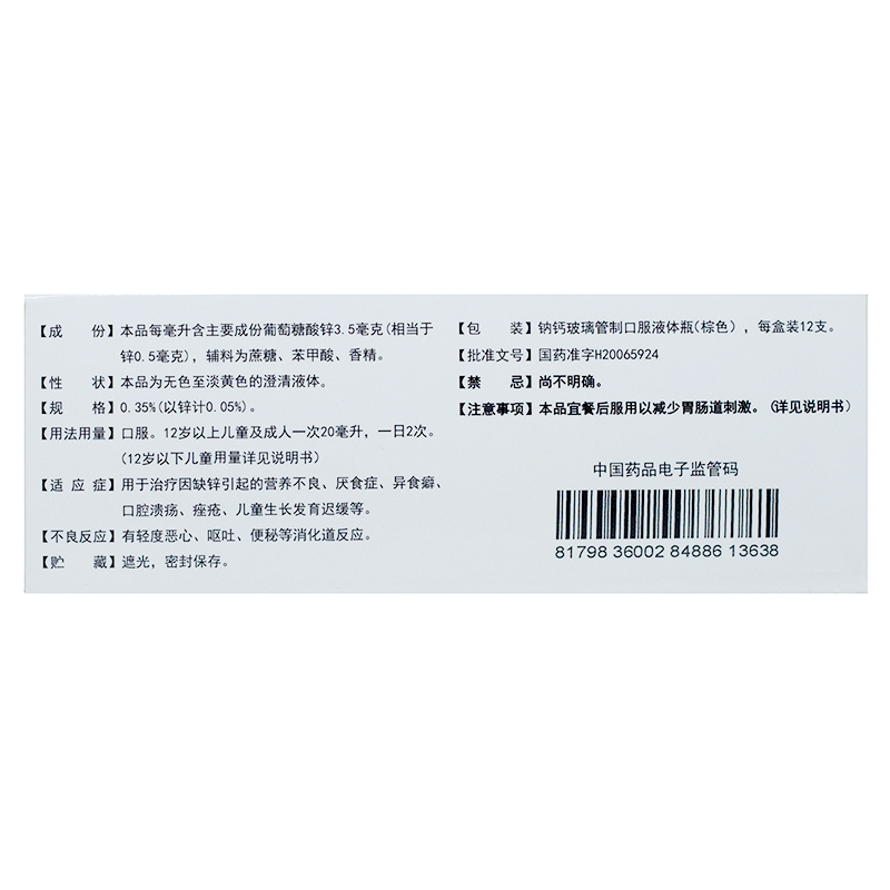 葡萄糖酸锌口服溶液(999) 10ml*12支 杭州老桐君制药有限公司