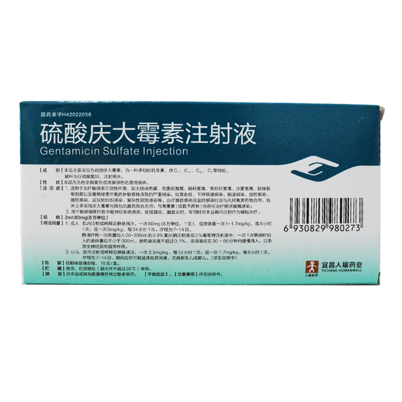 硫酸庆大霉素注射液 8万:2ml*10支 宜昌人福药业有限责任公司