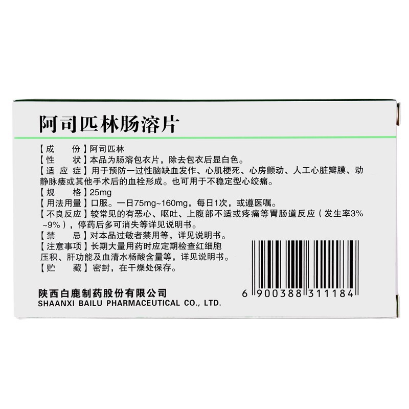 阿司匹林肠溶片 25mg*100s 陕西白鹿制药股份有限公司