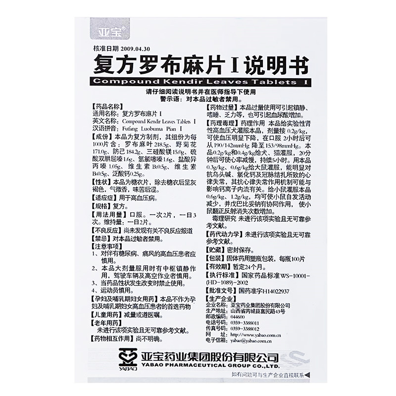 复方罗布麻片Ⅰ 100s 亚宝药业集团股份有限公司