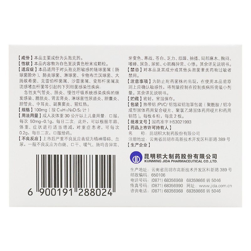 头孢克肟胶囊 0.1g*12s 昆明积大制药股份有限公司