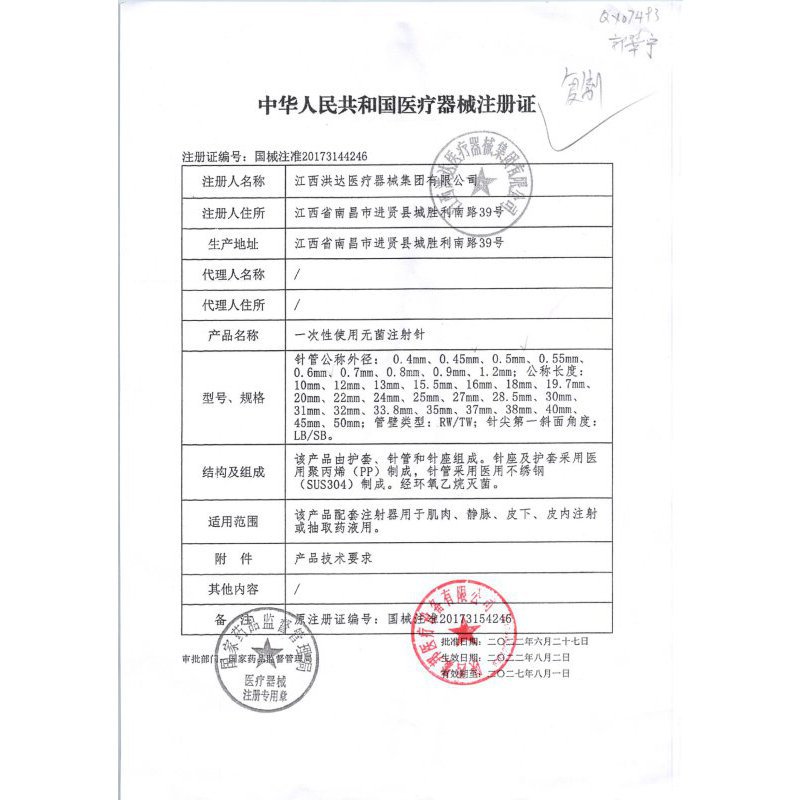 一次性使用无菌注射针【一次性注射针头】0.45# 江西洪达医疗器械集团有限公司
