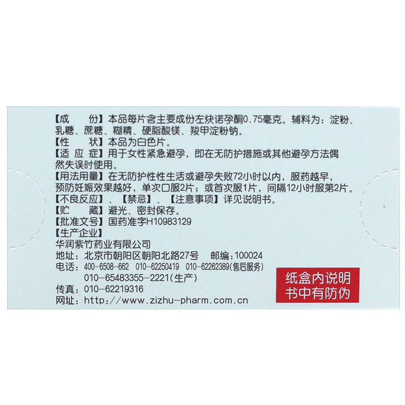 左炔诺孕酮片(毓婷片) 0.75mg*2s 华润紫竹药业有限公司