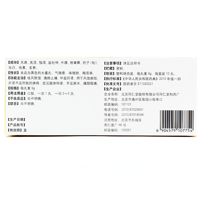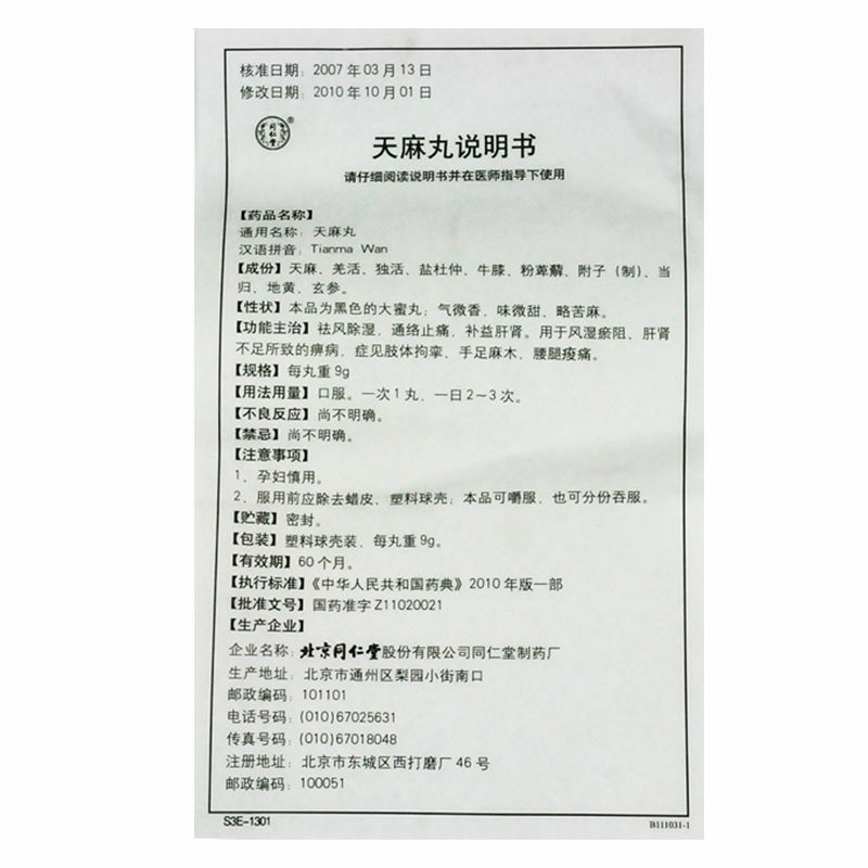 天麻丸 9g*10丸 北京同仁堂股份有限公司同仁堂制药厂