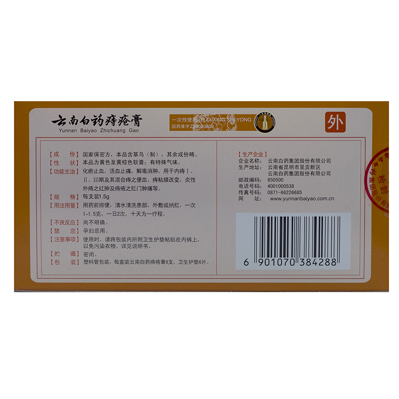 云南白药痔疮膏 1.5g*6支 云南白药集团股份有限公司