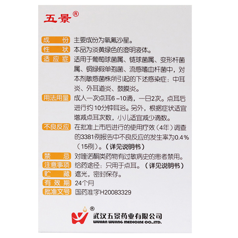 氧氟沙星滴耳液 5ml:15mg 武汉五景药业有限公司
