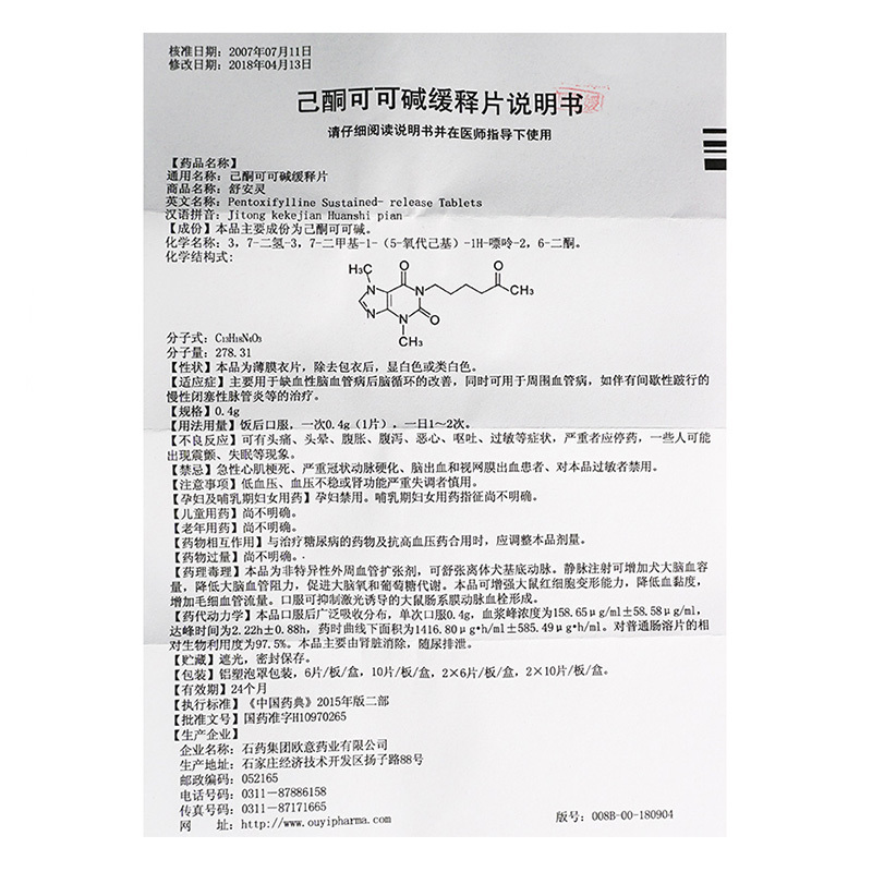 己酮可可碱缓释片 0.4g*10s 石药集团欧意药业有限公司