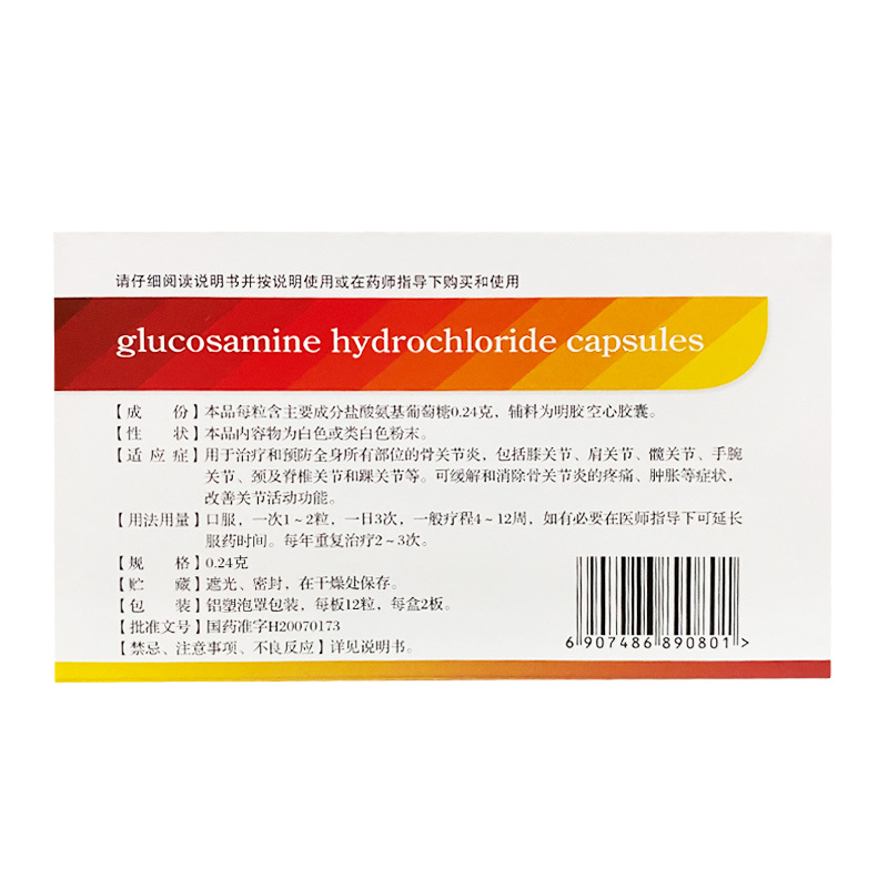盐酸氨基葡萄糖胶囊;适应症为用于治疗和预防全身所有部位的骨关节炎;包括膝关节、肩关节、髋关节、手腕关节、颈及脊椎关节和踝关节等