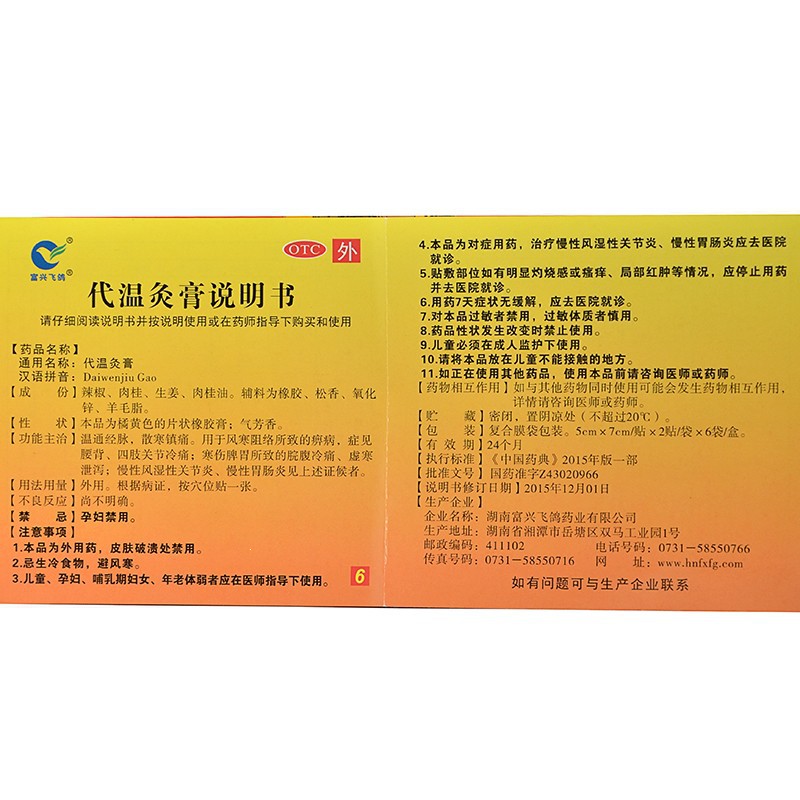 代温灸膏 5cm*7cm*2贴*6袋 湖南富兴飞鸽药业有限公司