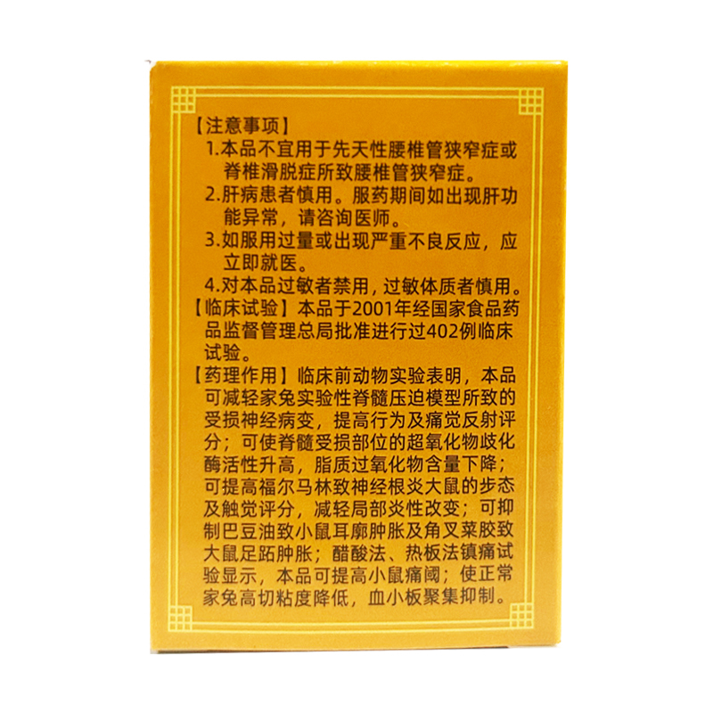 活血通督;益肾通络。用于腰椎管狭窄症(如黄韧带增厚、椎体退行性改变、陈旧性椎间盘突出)属瘀阻督脉型所致的间歇性跛行;腰腿疼痛;活动受限;下肢酸胀疼痛;舌质暗或有瘀斑等