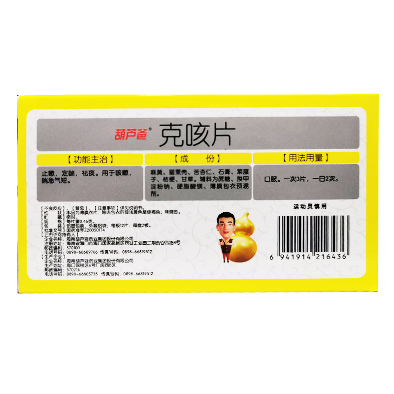 克咳片 0.46g*24s 海南葫芦娃药业集团股份有限公司