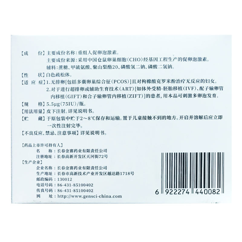 注射用重组人促卵泡激素 5.5μg(75iu)/瓶 长春金赛药业股份有限公司